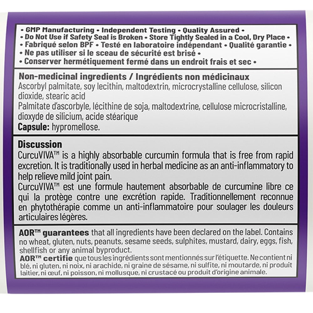 AOR - CurcuVIVA - 60 Capsule(s) - NPN: 80034713 -- CurcuVIVA provides an 80 mg maintenance dose of Longvida Optimized Curcumin for those with osteoarthritis, joint pain, chronic pain and more. Longvida Curcumin was specially formulated to provide a solution to the curcumin conundrum of low bioavailability, poor absorption and rapid breakdown. Although bioavailability and absorption help determine effectiveness, the key lies within its ability to remain free. This free state of curcumin is achieved due to the formulas ability to avoid being rapidly broken down within the body. Because free curcumin retains its unbroken form, it is then taken up through the lymph system into the bloodstream where it is stable, concentrated, and retains maximum effectiveness for up to 24 hours.Curcumin not only provides relief from joint pain and arthritis, but has many other benefits. It supports digestion, liver and gallbladder health, carries antibacterial, antifungal and antiviral effects, and even promotes healthy cholesterol levels and cardiovascular health.AOR AdvantageAORs CurcuVIVA advanced technology allows it to be absorbed very rapidly by the body, meaning that it is an excellent choice for rapid pain relief. Furthermore, with an effective dose of just one capsule per day CurcuVIVA is convenient and economical.
