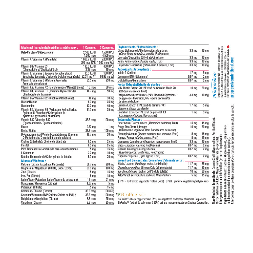 PROGRESSIVE - Multi Adult Women - 60 Capsule(s) - NPN: 80038008 -- Progressive MultiVitamins for Adult Women addresses the nutritional needs of a normal modern lifestyle. For those who do not exercise, who experience average stress, and are not constantly on the go, Progressive MultiVitamins for Adult Women is the perfect fit. Provides free radical defense Balances pH Strengthens immune function Supports healthy thyroid function Assists with healthy digestion Promotes clear, healthy skin