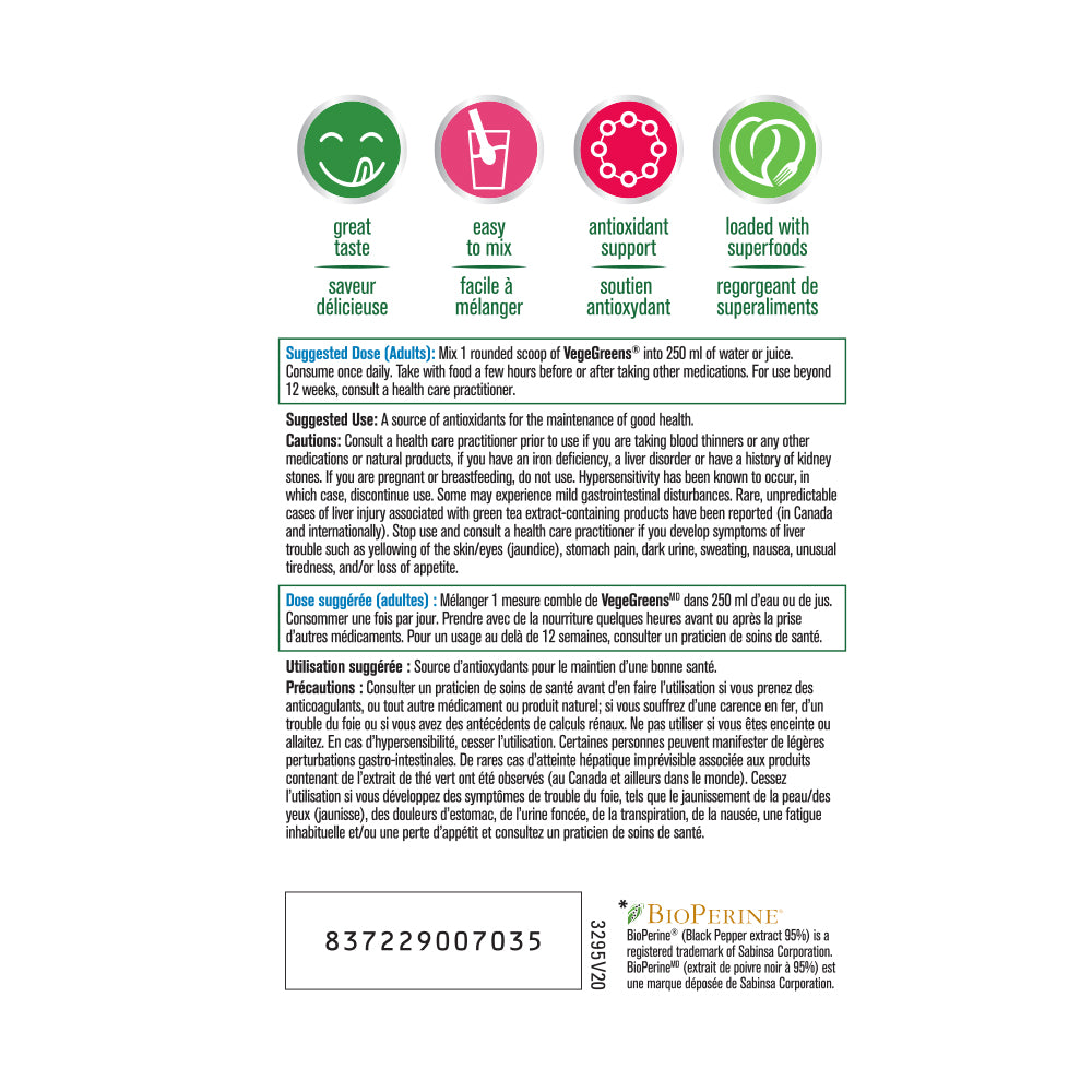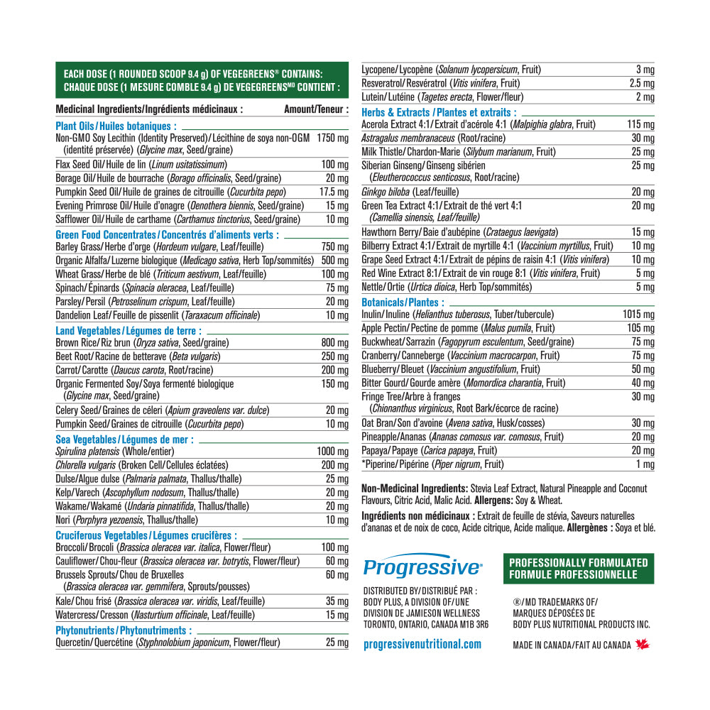 PROGRESSIVE - VegeGreens - 265 Gram(s) - NPN: 80034973 -- The Ultimate Super FoodVegeGreens is a comprehensive combination of over 60 land, sea and cruciferous vegetables, as well as super green foods, plant oils, phytonutrients, herbs & extracts and botanicals. With 8 distinctive blends of green foods and plant extracts, VegeGreens supplies an extraordinary spectrum of nutrients ranging from the rare trace minerals found in sea vegetables to the health-enhancing compounds exclusive to cruciferous vegetables. Each small scoop provides the nutrient equivalent of 6 to 8 servings of fresh vegetables
