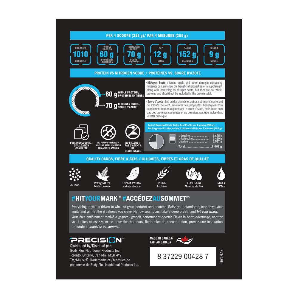 Precision - BIG TIME Weight Gain - 2.72 Kilogram(s) - NPN: 80057211 -- When we say BIG TIME contains 60g of protein, we really mean 60g of protein. Absolutely no amino-acid spiking or cheap fillers to give you a false number. Whole protein is what your body needs to get the full 9 essential amino acids for muscle repair after a hard days work in the gym.Amateurs eat anything and everything to gain weight. But youre an elite athlete - you know better. A high-calorie + clean-calorie supp is what you want. BIG TIME gives you exactly that: quality & quantity. Think 900+ calories from real food sources like quinoa, sweet potato, and inulin. Sugar its bad for your gut and body. BIG TIME contains only 9g of sugar per 4 scoops. But, less sugar doesnt have to equal boring taste. With 3 decadent flavours (Triple Chocolate Sundae, Vanilla Frosting, Cookies & Cream), you can enjoy amazing taste without the insulin spike.