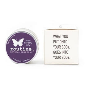 Routine - Deodorant - Baking Soda Free - Blackberry Betty - 58 Gram(s)--GENTLY TREATS ON ALL SKIN TYPES: In our 2.05 oz jar of natural deodorant, we've replaced the baking soda with dietary magnesium to keep even the most sensitive-skinned individuals safe from irritation and to reduce stinky stress sweats relaxing those holesSweet and fruity: Predominantly scented with blackberries and vanilla, this natural deodorant has a sweet, fruity, and long-lasting scent, making it a perfect deodorant for everyday use.NATURAL INGREDIENTS: Made with naturally derived ingredients, this natural deodorant for men and women is free of aluminum, synthetic fragrances, alcohol, parabens, and phthalates. This extra-sensitive skin formula contains no baking soda, therefore may need reapplication. FOR MEN AND WOMEN: Our aluminum free deodorant is suitable for both men and women to keep them fresh, confident and smelling good for a long time.