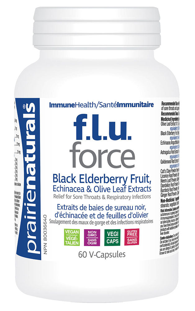 PRAIRIE NATURALS - FLU Force - 30 Vegetarian Capsule(s) - NPN: 80036640 -- FLU-Force a potent blend of herbs recognized for their anti-viral and immune supporting function. Olive leaf Extract, Black Elderberry & Echinacea Angustifolia Extracts are blended with Astragulus, Golden Seal, Dandelion, Cats Claw, Licorice Root, Neem Leaf, Burdock Root and Ginger Root to help relieve the symptoms of sore throats and upper respiratory tract infections.