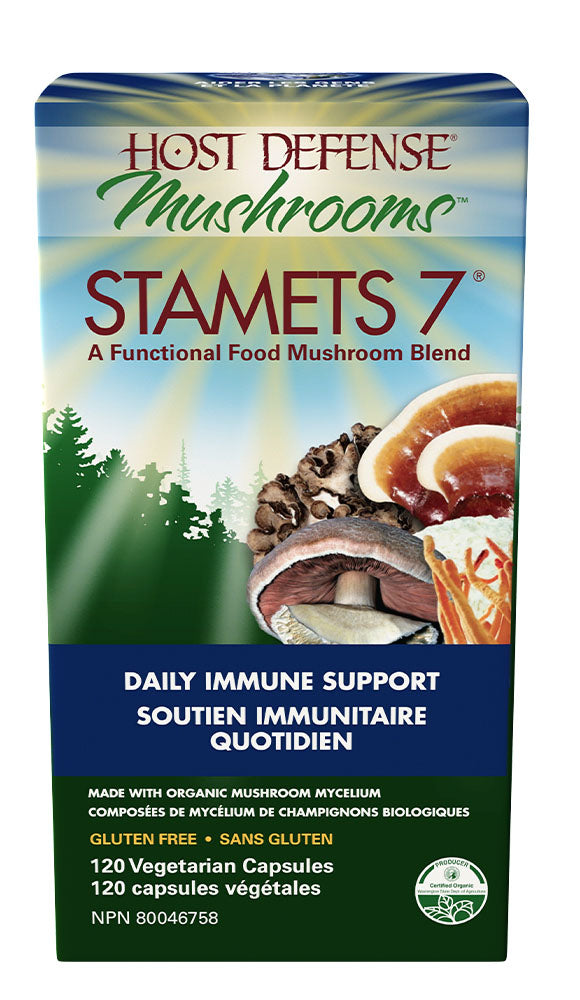 • Host Defense® Stamets 7® Capsules use activated, freeze-dried, Certified Organic mycelium, with a full spectrum of constituents: polysaccharides (beta glucans, arabinoxylane, glucose, xylose, galactose and cordycepic acid), glycoproteins, ergosterols, triterpenoids and other myco-nutrients, which are essential for Supporting Natural Immunity.Paul Stamets designed this blend of seven mushroom species (Royal Sun Blazei, Cordyceps, Reishi, Maitake, Lions Mane, Chaga and Mesima) to support general immunity.