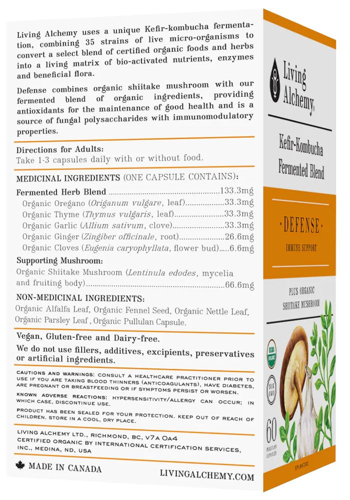 Living Alchemy - DEFENSE: Immune Support - 60 Capsule(s) - NPN : 80073182Daily Immune SupportFast & Effective Relief for Cold & FluRebalances Microbial OvergrowthManages Yeast BalanceDEFENSE provides therapeutic nutrients from fermented, activated herbs such as oregano, thyme, garlic, ginger & clove plus shiitake mushroom to help keep your defenses up.Living Alchemy use a unique Kefir-kombucha fermentation, combining diverse strains of live micro-organisms to convert a select blend of certified organic foods and herbs into a living matrix of bio-activated nutrients, enzymes and beneficial flora.Fermentation Activated Herbal Blend Plus Organic Shiitake MushroomTraditional Long Fermentation of Organic Whole Foods & HerbsUnique Kefir-Kombucha FermentationRich in Activated NutrientsSuperior AbsorptionPowerful Yet Gentle Targeted FormulaCertified USDA OrganicVegan, Gluten-Free and Dairy-Free
