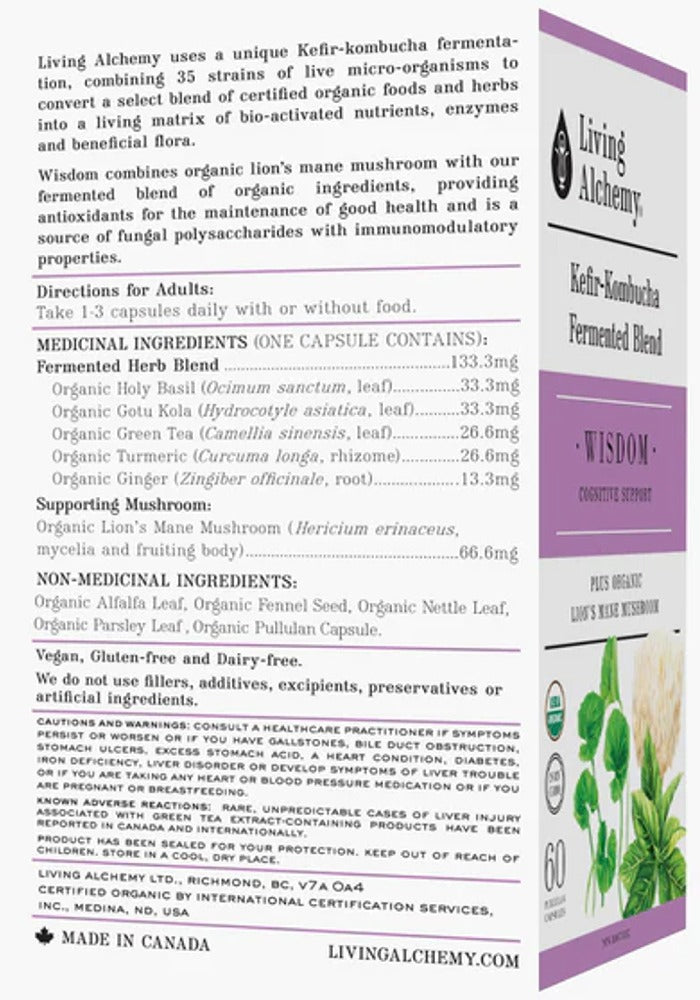 Living Alchemy - WISDOM: Cognitive Support - 60 Capsule(s) - NPN : 80073187Enhances Brain PerformanceAssists with Focus & ConcentrationAids Mood & MemoryCognitive & Nerve SupportA healthy and active mind requires an abundance of nutrition. WISDOM provides fermented, activated nutrients from holy basil, gotu kola, green tea, turmeric & ginger plus lions mane mushroom to keep your cognition sharp.Living Alchemy use a unique Kefir-kombucha fermentation, combining diverse strains of live micro-organisms to convert a select blend of certified organic foods and herbs into a living matrix of bio-activated nutrients, enzymes and beneficial flora.Fermentation Activated Herbal Blend Plus Organic Lion's Mane MushroomTraditional Long Fermentation of Organic Whole Foods & HerbsUnique Kefir-Kombucha FermentationRich in Activated NutrientsSuperior AbsorptionPowerful Yet Gentle Targeted FormulaCertified USDA OrganicVegan, Gluten-Free and Dairy-Free