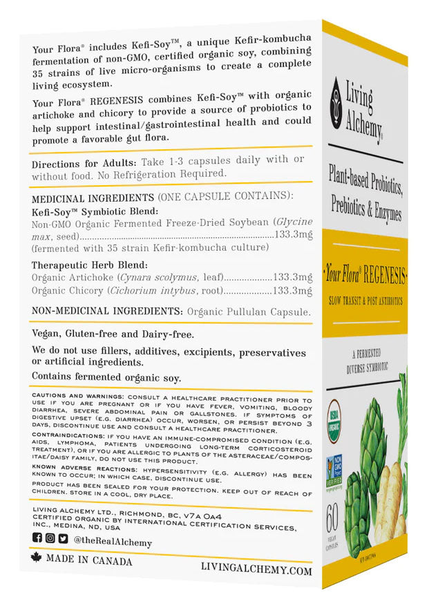 Living Alchemy - Your Flora® REGENESIS: Slow Transit & Post Antibiotics - 60 Vegan Capsule(s) - NPN:80071906 -- Alleviates Bowel Congestion & Improves Transit Time Post Antibiotics or Infection Aids Liver Functions Helps Support Intestinal/Gastrointestinal Health & Promotes a Favorable Gut FloraLiving Alchemy Your Flora Regenesis provides probitotics, prebiotics and digestive enzymes as well Organic Kefi-Soy to help create a natural harmony of micorflora in the digestive tract. Formulated to optimize healthy gut flora and immune support, Your Flora Regenesis alleviates bowel congestion while aiding living functions. Your Flora Regenesis is shelf stable; meaning it requires no refrigeration.There are times when it is necessary to restore your gut flora. Establishing a healthy gut flora is a journey, not a race. Kefi-Soy provides the ideal foundation for you to naturally create and develop a rich and diverse ecosystem specific to you and your unique constitution.Your Flora REGENESIS combines our fermented Diverse Strain Kefir-Kombucha Fermentation Symbiotic with organic artichoke and chicory specifically for those aiming to re-establish a healthy digestive ecosystem and smooth digestive function.One Complete Digestive Solution: Your Flora SymbioticsProvides Probiotics, Prebiotics & Digestive Enzymes80% Survival Rate of Microbes in the GutDiverse Strain Kefir-Kombucha FermentationPlus Organic Blueberry & BananaSuperior AbsorptionShelf stable. No Refrigeration RequiredWhole Food Source Symbiotics