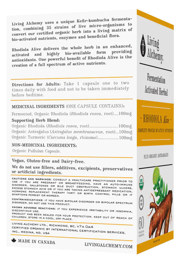 LIVING ALCHEMY Rhodiola Alive - 60 Capsule(s) - NPN: 80079054 -- Increases Stamina & EnergyImproves Recovery Time from WorkoutIncreases Glycogen for Improved Athletic PerformanceProvides A Complete Profile of Fermentation Activated NutrientsLiving Alchemy uses the ancient art of fermentation to activate Rhodiola into its superior form for RHODIOLA Alive. We ferment our finest organic Rhodiola using a month long fermentation containing a diverse species of micro-organisms from kefir and kombucha cultures. This activation delivers the complete synergy of the herb within a living food matrix for exceptional vitality and bio-availability.Rhodiola has a long tradition for being a herb to support both physical and mental stamina. Even Olympic athletes and astronauts have used Rhodiola for its supportive anti-stress and anti-fatigue effects. In this modern life of constant, energy-depleting stress, Rhodiola provides the perfect support.When our whole Rhodiola is long fermented, the full spectrum of nutrients are activated and the effects become far greater. Our fermented, organic Rhodiola has been the subject of some impressive studies including a greater effect than Rhodiola extract after 7 days on both stress & anxiety. As well as, our fermented Rhodiola increased stamina under stress and increased lactate, a fuel used by the body during exercise to decrease fatigue.Traditional Long Fermentation of Organic Whole HerbsUnique Kefir-Kombucha FermentationA Complete Profile of Fermentation Activated NutrientsSuperior AbsorptionVegan, Gluten-Free and Dairy-FreeNo Fillers, Additives or Excipients